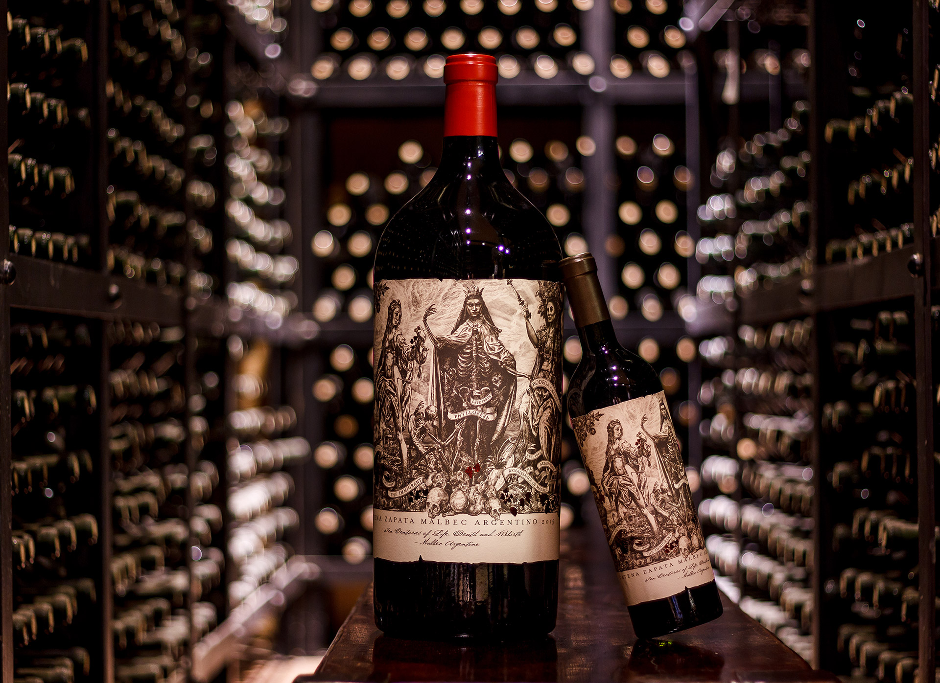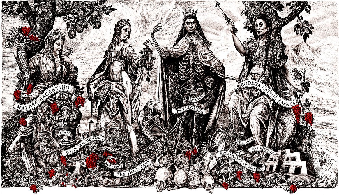 The epic tale of the noble Malbec grape is like no other, and the label for Catena Zapata Malbec Argentino pays tribute to the variety’s history in France and its rise in Argentina. Four female figures embody different landmarks in the history of the grape.